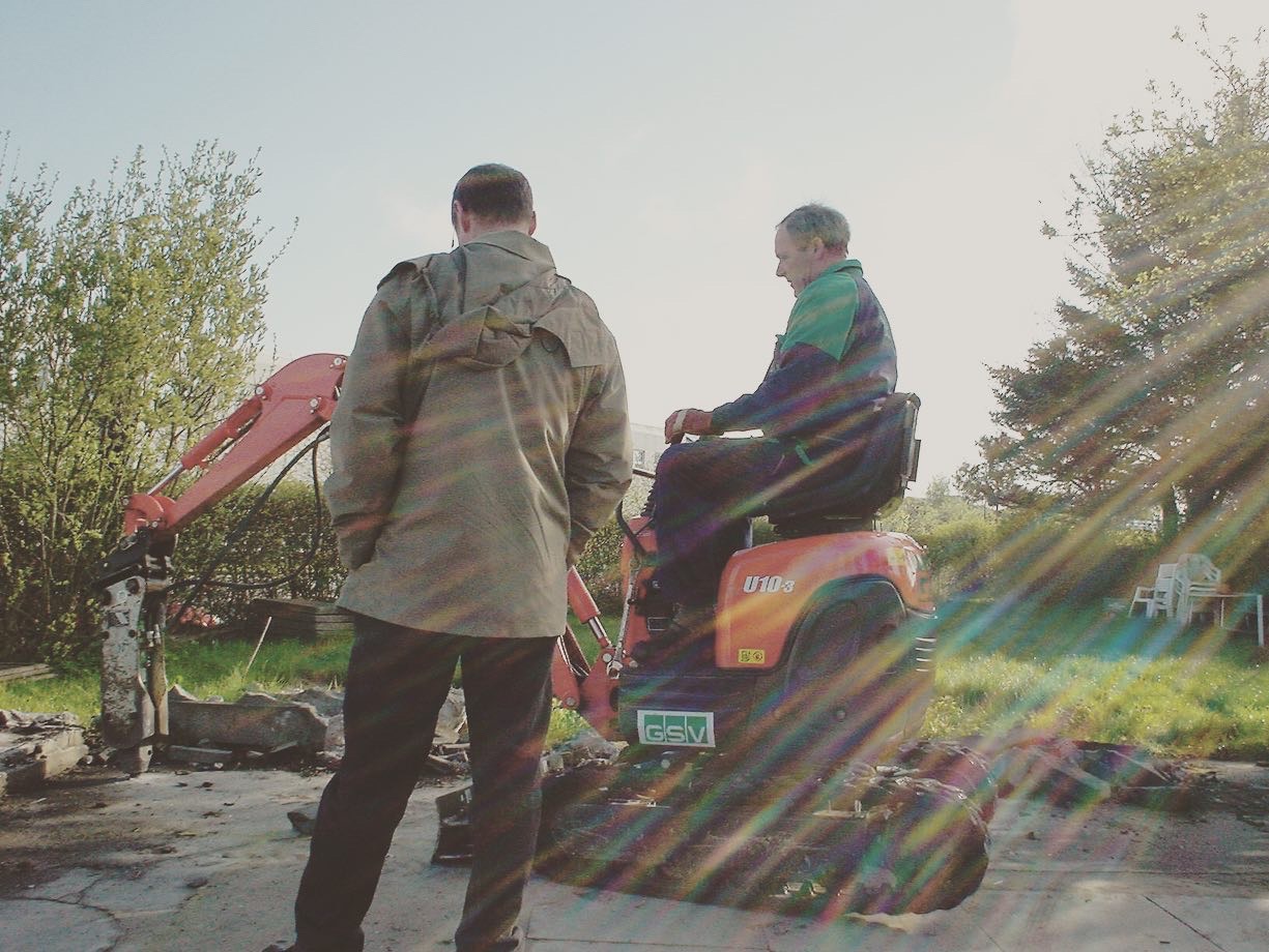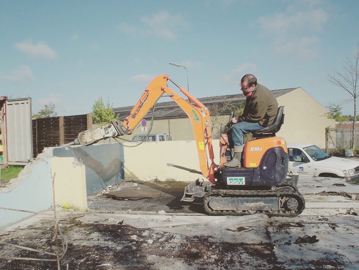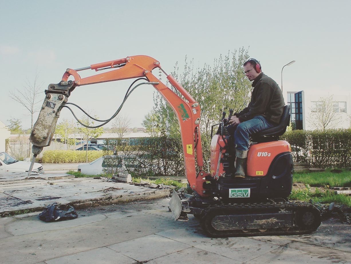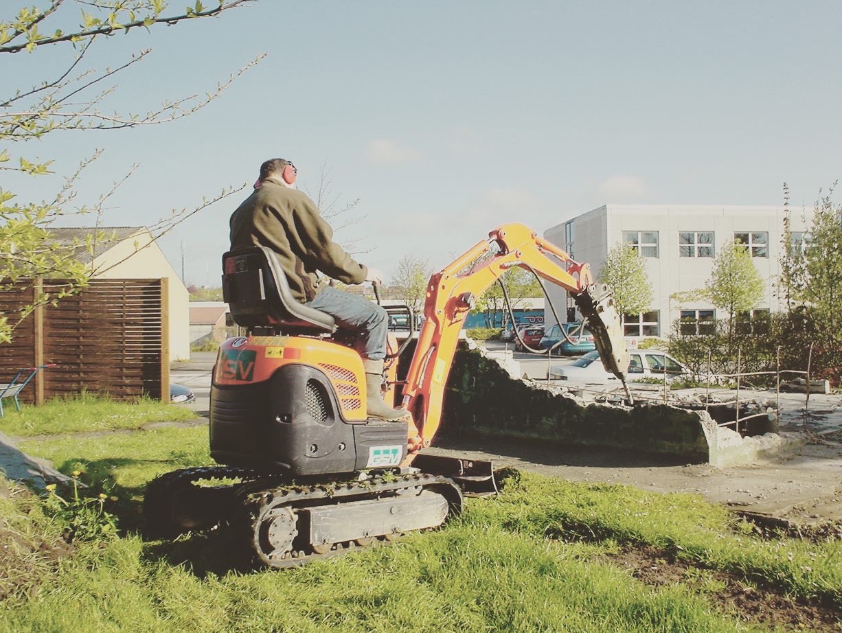 Vi lejer en minigraver med betonhammer. Dieter får instrukser, og hamrer herefter ivrigt løst.