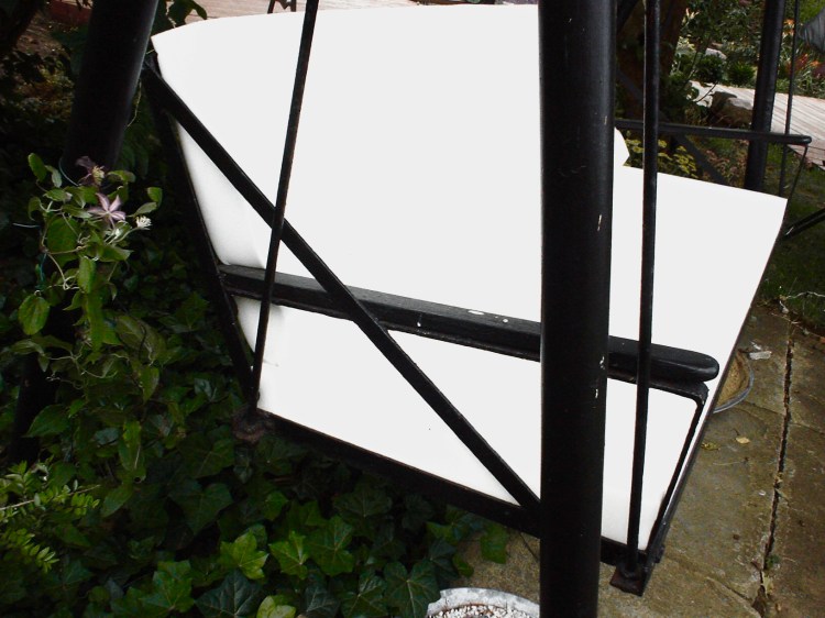 Den har siden dag et, set forfærdelig ud; manglende sæde, godt rusten, og ja; i det hele taget et faldefærdigt, og trist syn.